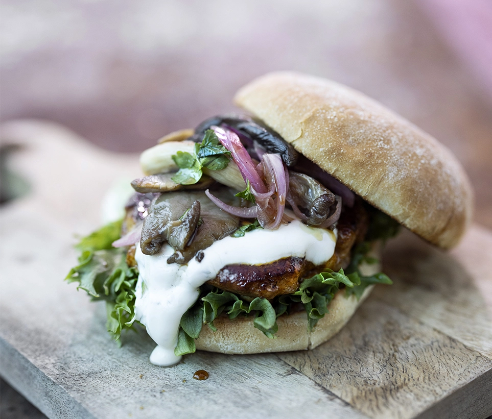 Burgerbrød varmes med snittsiden ned og toppes med rømmedressing.