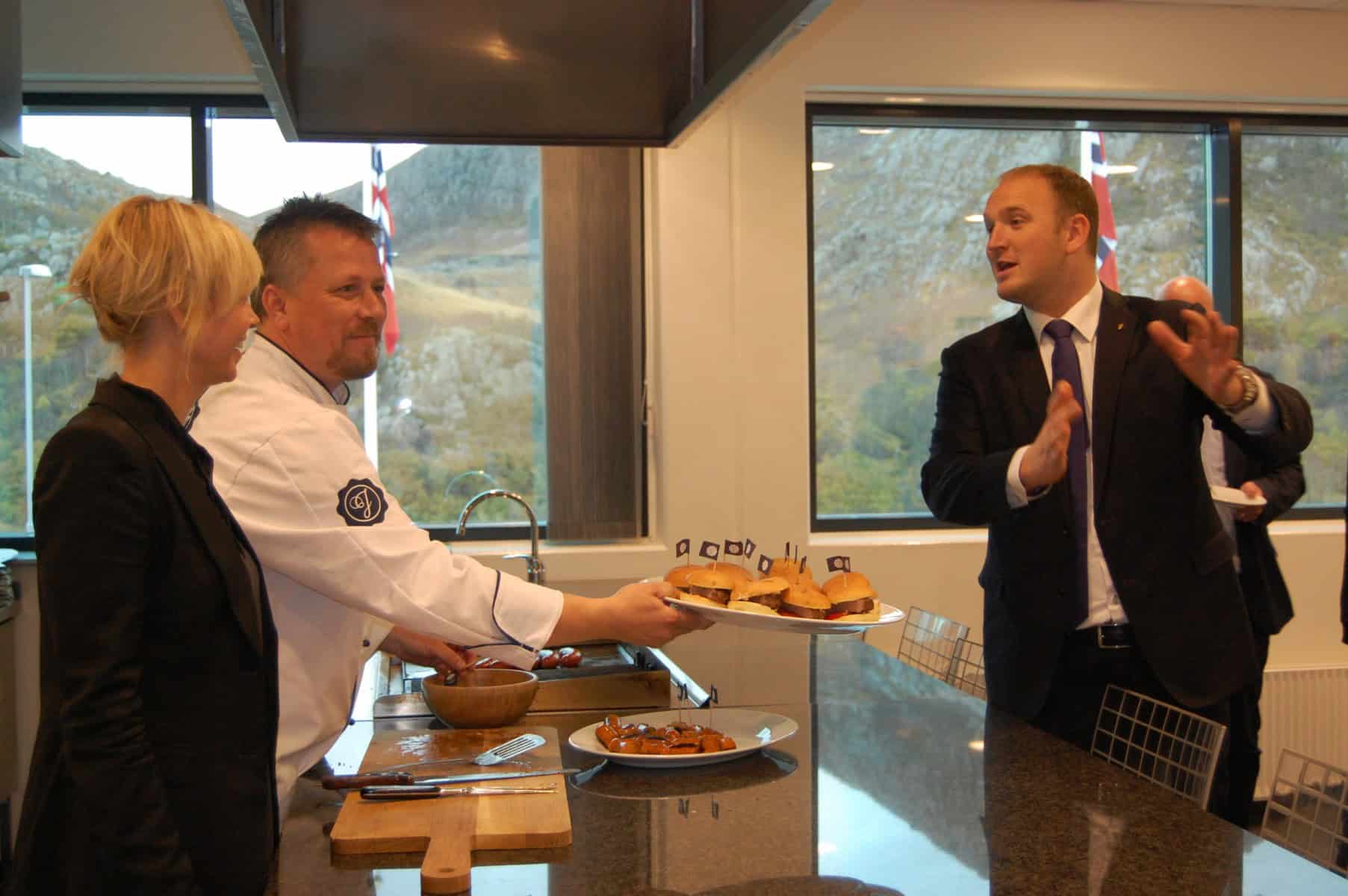 Etter omvisningen ble det servert smaksprøver på Jæderkjøkkenet. På menyen var det hamburger og ulike pølsesorter.