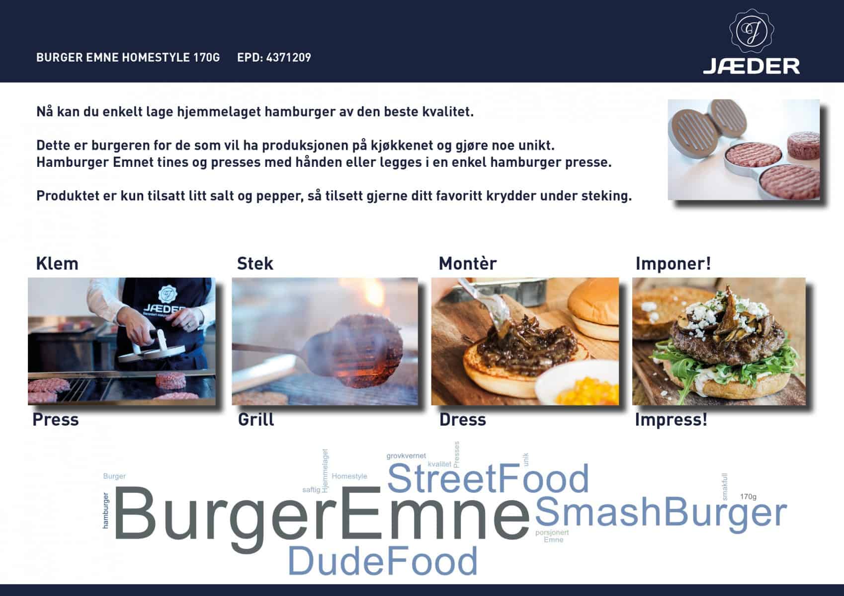 Hamburger Emnet tines og presses med hånden eller legges i en enkel hamburger presse. Produktet er kun tilsatt litt salt og pepper, så tilsett gjerne ditt favoritt krydder under steking.